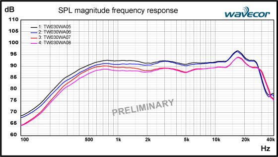 Firma Wavecor, chociaż od kilku lat obecna na europejskim rynku, dopiero w tym roku zdecydowała zaznaczyć swoją obecność na High End Show w Monachium. Prócz znanych już przetworników zaprezentowała nową serię niskośredniotonowych przetworników i bardzo ciekawą kopułkę wysokotonową. Prezentowany tweeter TW030WA05-08 oparty na 30mm membranie (ulubiona średnica chińskiej wytwórni) wydaje się być doskonałą propozycją w szczególności dla dwudrożnych kolumn głośnikowych. Wyjątkowo niska częstotliwość rezonansowa wynosząca zaledwie 450Hz w połączeniu z bardzo liniową charakterystyką częstotliwościową (spadek zaczynający się w okolicach 600Hz) pozwala na ustawienie niskiej częstotliwości podziału zwrotnicy. Według producenta głośnik przy zwrotnicy II-go rzedu i częstotliwości podziału 2kHz wytrzyma 50W-60W (w zależności od wersji) ciągłego obciążenia (wg normy IEC 268-5). Biorąc pod uwagę niskie ceny głośników Wavecor, będzie to z pewnością bardzo kusząca propozycja dla miłośników DIY.