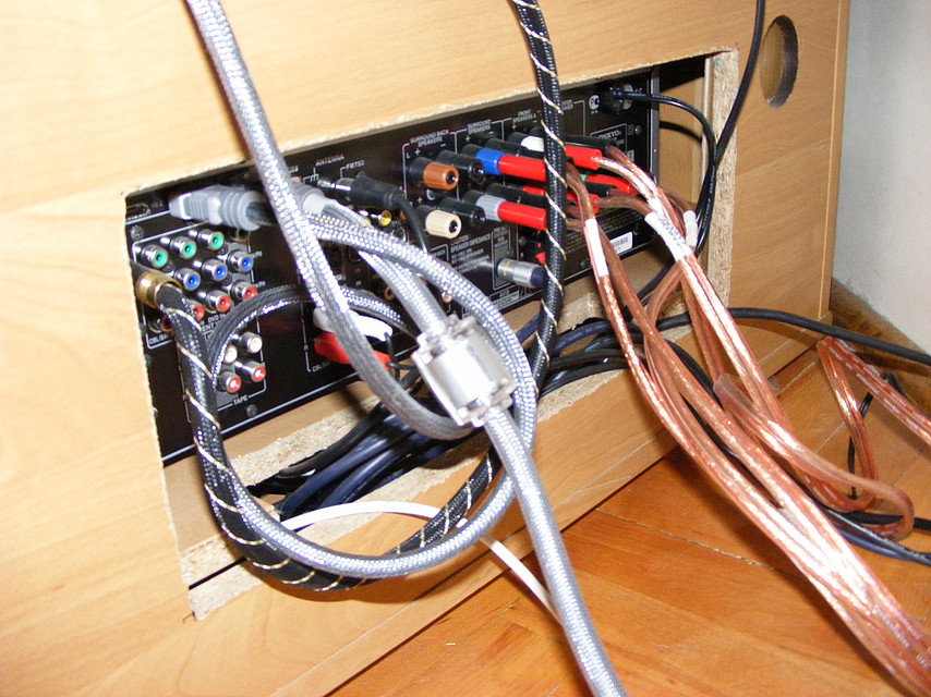Sprzęt audio był baaardzo skromny, komputerowy zestaw dolby digital 5.1 Creative kupimy w 2000r (wtedy był to koszt około 1000zł.). Następnie dokupiłem amplituner ONKYO TX-SR505E i kolumny Quadral Quintas 500 + sub. Kable rca alphard DaVinci, hdmi Tech+link WiresXS, a głośnikowe, wstyd się przyznać, kupione na allegro. Zmieniłem podparcie kolumn frontowych na przykręcone blachy grubości 8mm z kolcami. Całość prezentuje się o wiele lepiej niż w oryginale. Nie jestem maniakiem dźwięku, choć myślę o czymś lepszym. Na razie musi mi wystarczyć to co mam. Wiele osób ma podobne zestawy tzw. budżetowe.